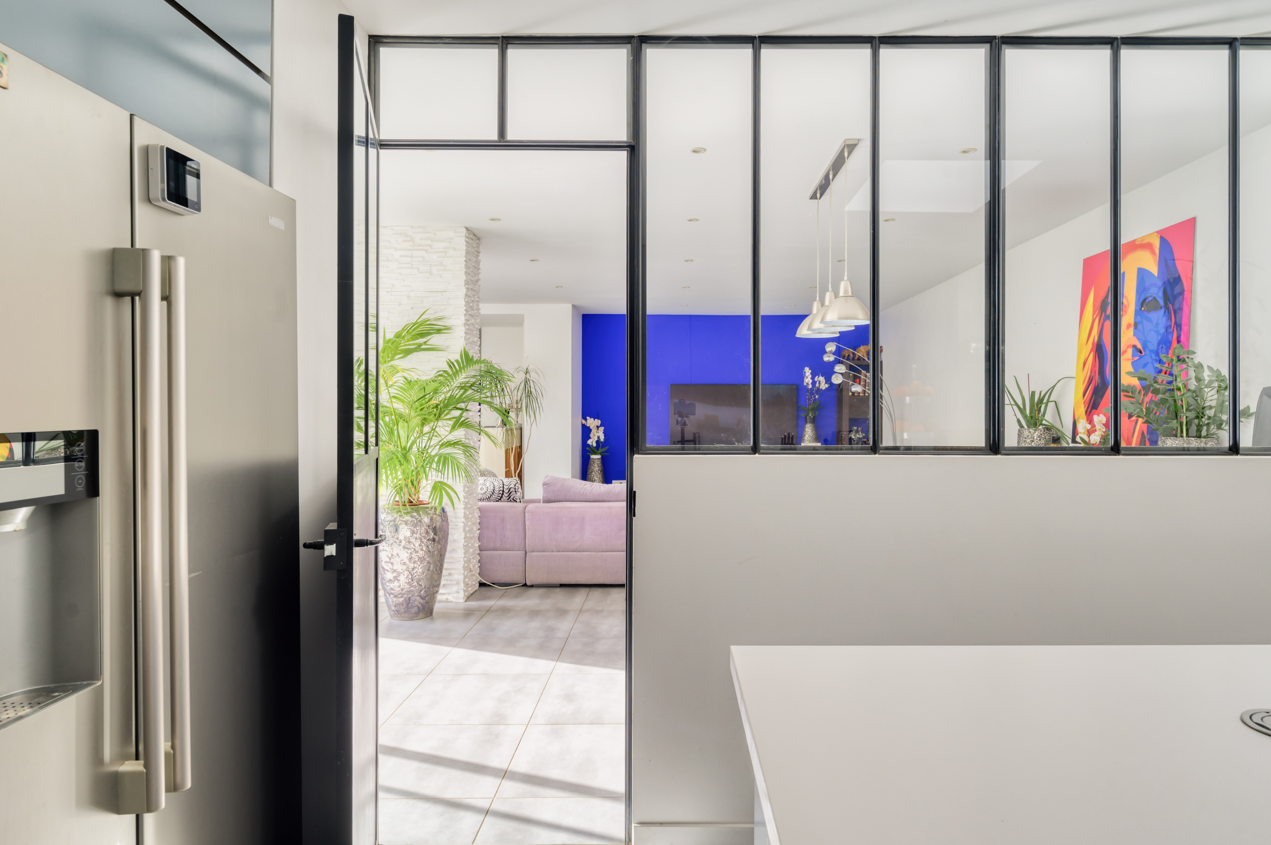 La cuisine équipée et séparée par une verrière donne accès à la grande pièce de vie, idéal pour vos repas en famille.